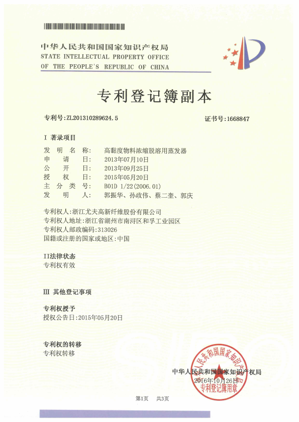 高黏度物料濃縮脫溶用蒸發器 受讓專利登記簿